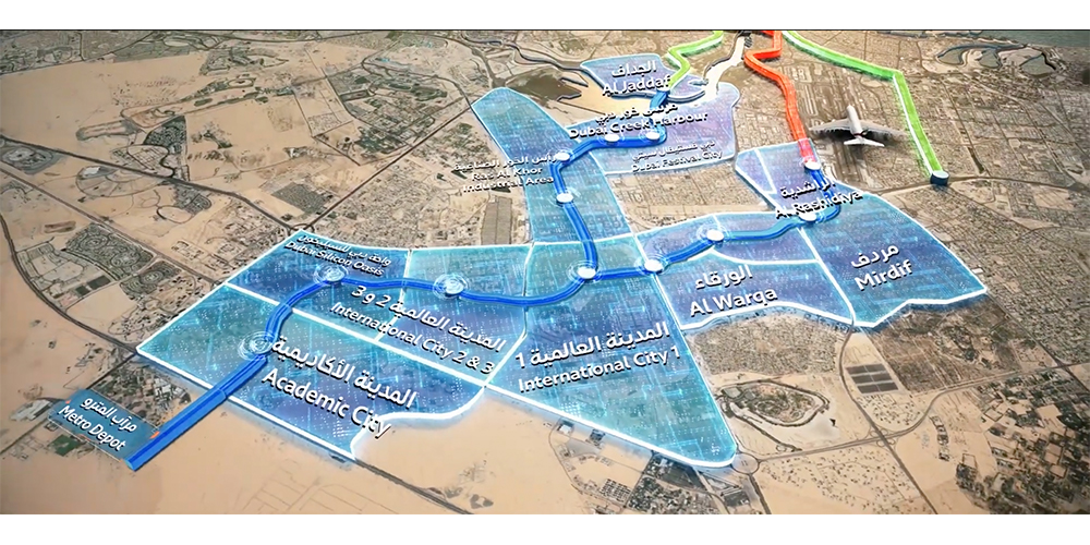 • Passes through Dubai Festival City, Dubai Creek Harbour, Ras Al Khor, International City 1, International City 2 and 3, Dubai Silicon Oasis, and Academic City.